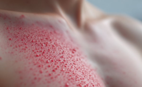 피부에 물집(수포)이 무리지어 올라옵니다. 1~2일 이내 빠르게 퍼질 수 있습니다.