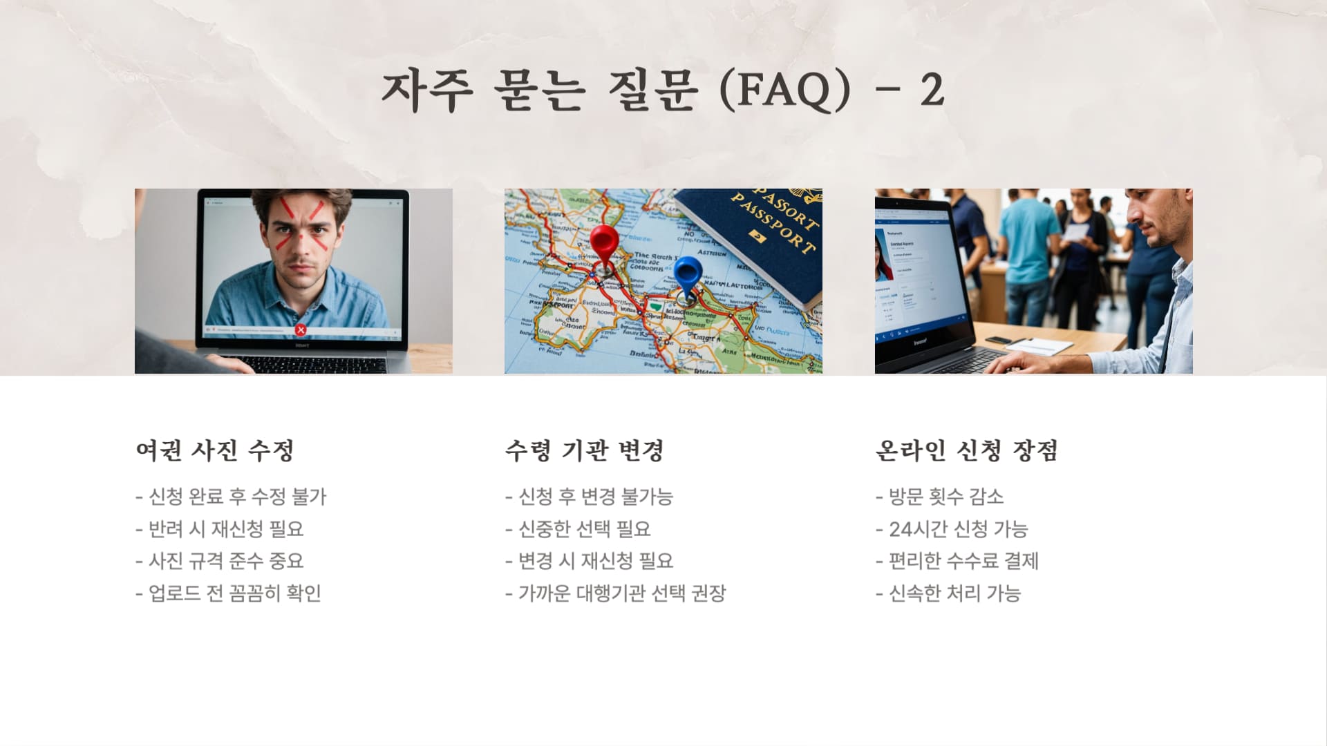 - 최근 6개월 이내 촬영한 여권용 증명사진 필수